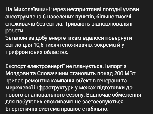 Крім цього, директор ДПЕК Дмитро Сахарук заявляв, що наступної зими енергетики можуть повернутися до практики віялових відключень. За його словами, існує ймовірність відключень навіть улітку, але все ж таки ДТЕК сподівається, що до цього не дійде - завдяки тому, що є можливість перекрити умовний дефіцит імпортом.