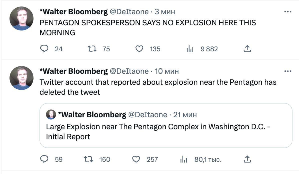 Проте невдовзі спікер Пентагону повідомив журналістів, що жодного вибуху не було. А твіттер-акаунт, який повідомив про це, видалив твіт, написав журналіст Вальтер Блумберг.
