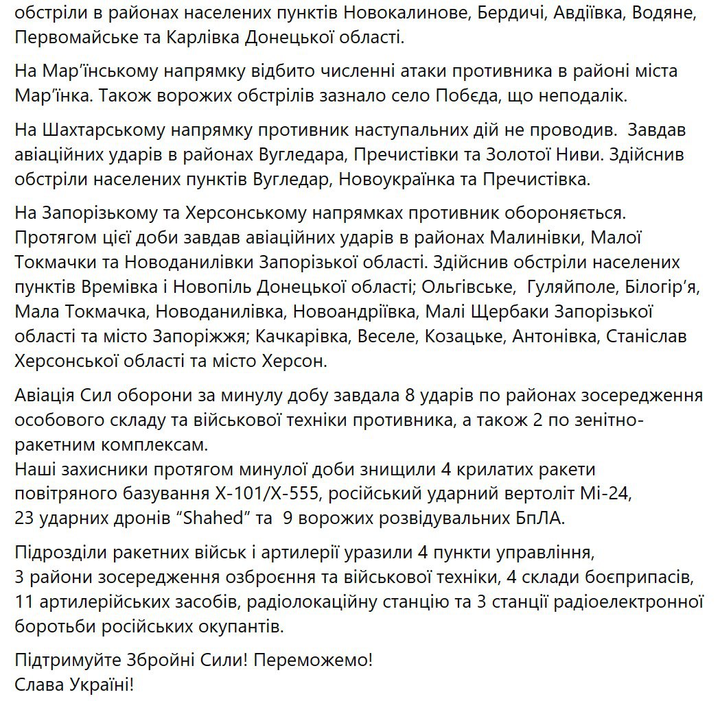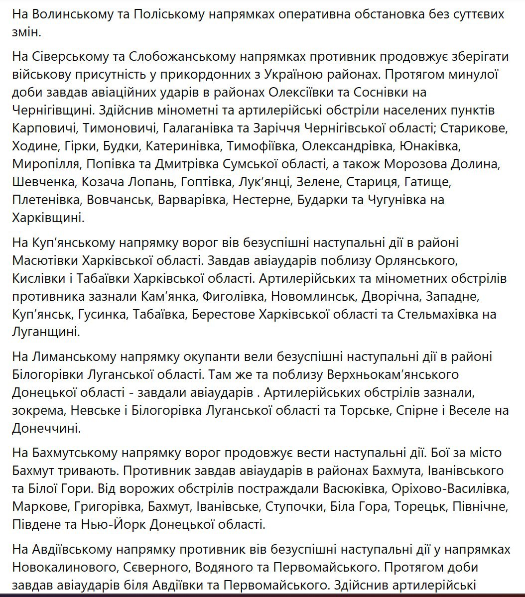 3. На Волинському, Поліському, Сіверському, Слобідському, Куп'янському, Авдіївському, Шахтарському, Запорізькому та Херсонському напрямах ситуація без істотних змін.