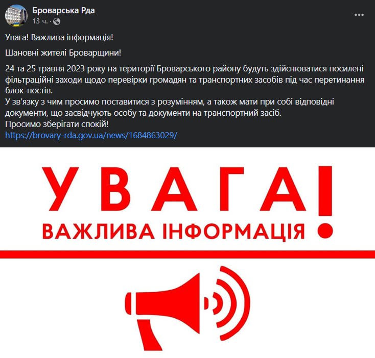 Також посилені фільтраційні заходи очікуються у Броварському районі 25 травня.