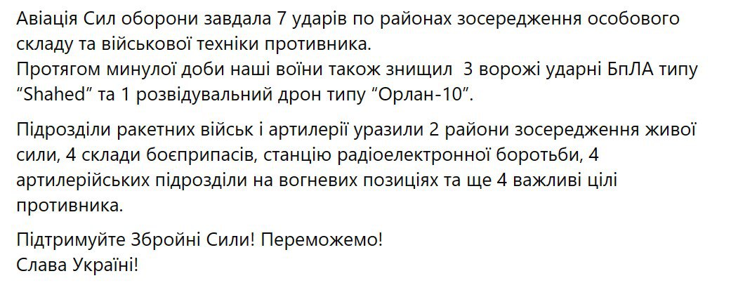 4. Авіація ЗСУ завдала чотирьох ударів. Українська ППО знищила 36 із 36 БПЛА Shahed-136/131, використані РФ проти України.