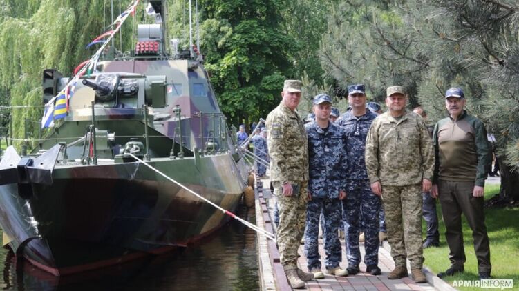 Фото із Залужним під час сьогоднішньої передачі Військово-морським силам артилерійського катера "Буча" публікують ресурси Міноборони.
