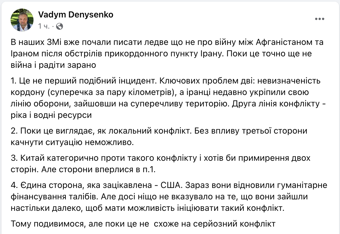Керівник "Українського інституту майбутнього" Вадим Денисенко коментує повідомлення українських ЗМІ про "чи не про війну між Афганістаном та Іраном", які з'явилися після обстрілу прикордонного пункту Ірану.