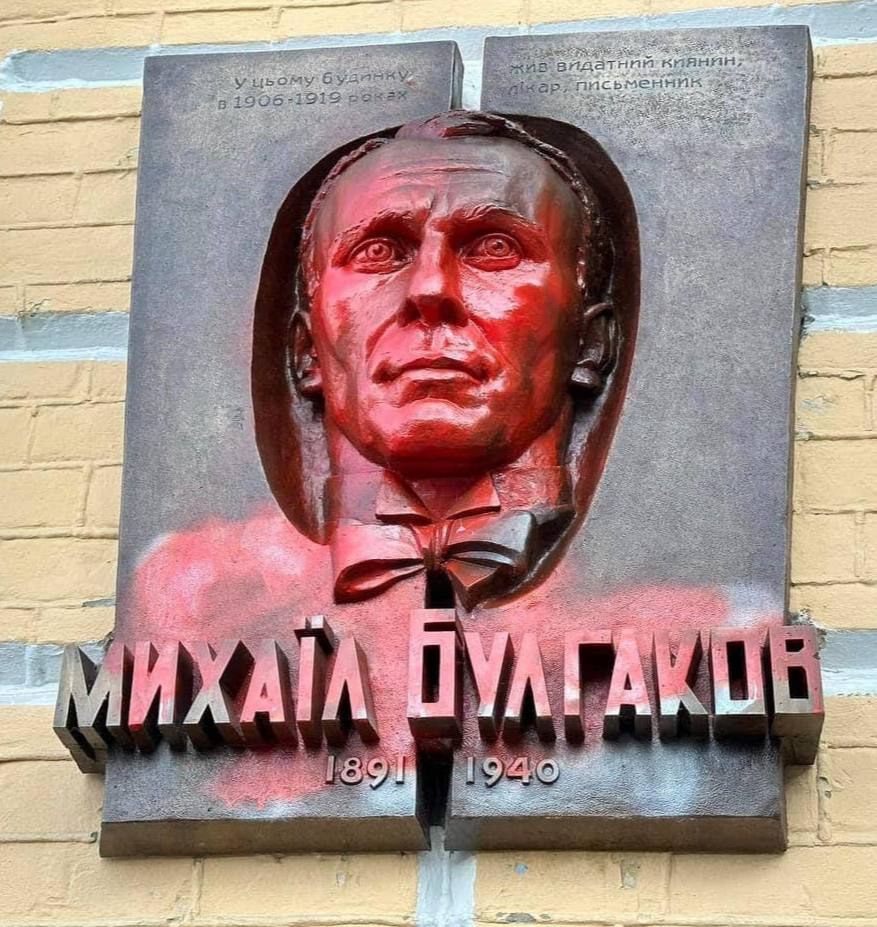 При цьому вже нову меморіальну дошку на фасаді будинку-музею письменника Михайла Булгакова невідомі облили червоною фарбою.