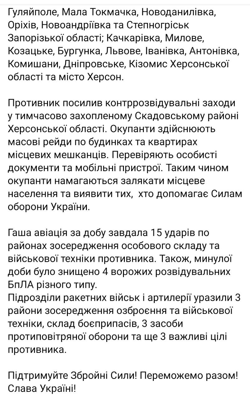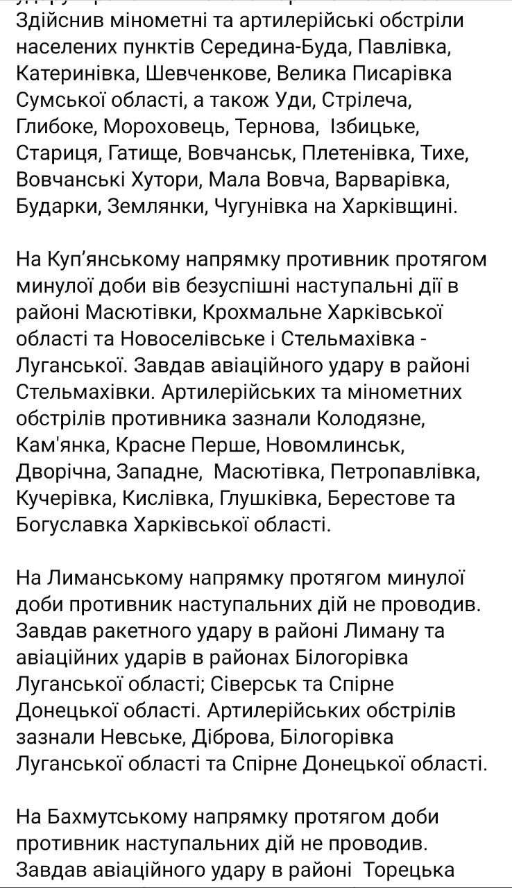 - Під Куп'янськом противник наступав у районі Масютівки, Крохмального, Стельмахівки та Новоселівського.
