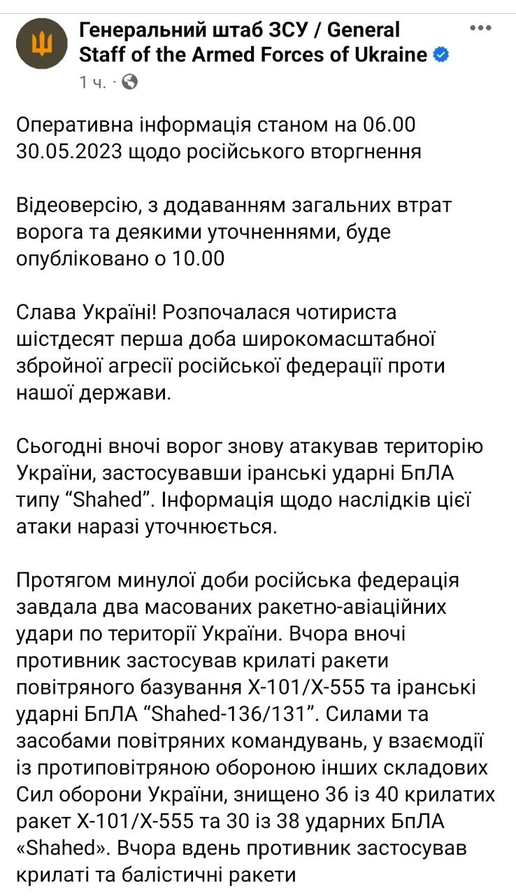 Генштаб ЗСУ опублікував ранкове військове зведення станом на 30 травня на своїй станиці у Facebook.