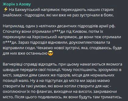 За словами Жоріна, ПВК "Вагнер" справді виходить із населеного пункту, намагаючись якнайшвидше передати свої позиції військовим. За його словами, у місті зараз немає нормальних позицій для утримання його росіянами. Крім того, за його словами, українські війська мають намір взяти Бахмут у кільце, обійшовши його флангами.
