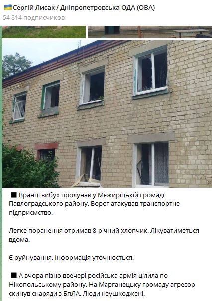 07:40 Вранці росіяни обстріляли Межирецьку громаду Павлоградського району Дніпропетровської області. Ворог атакував транспортне підприємство.