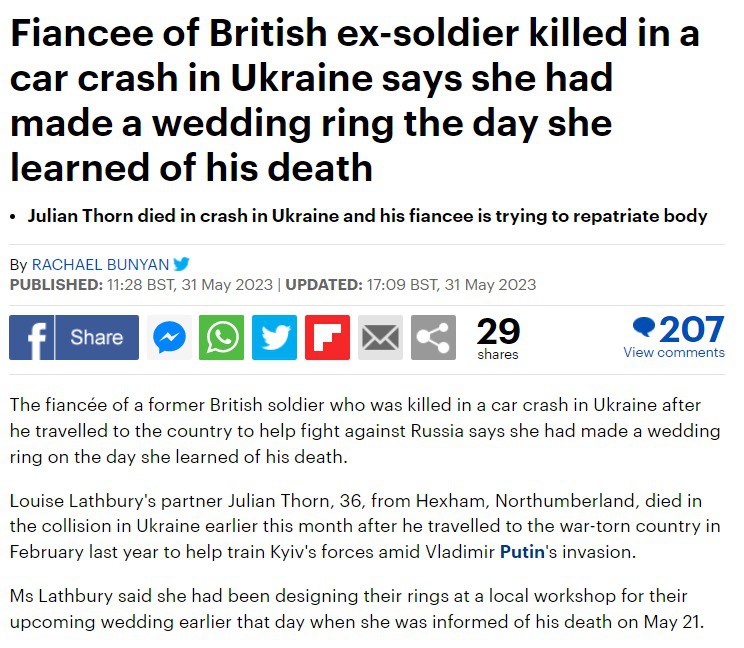 23.03 В Україні в автокатастрофі загинув снайпер із Великобританії Джуліан Торн, який приїхав сюди для підготовки військовослужбовців ЗСУ.