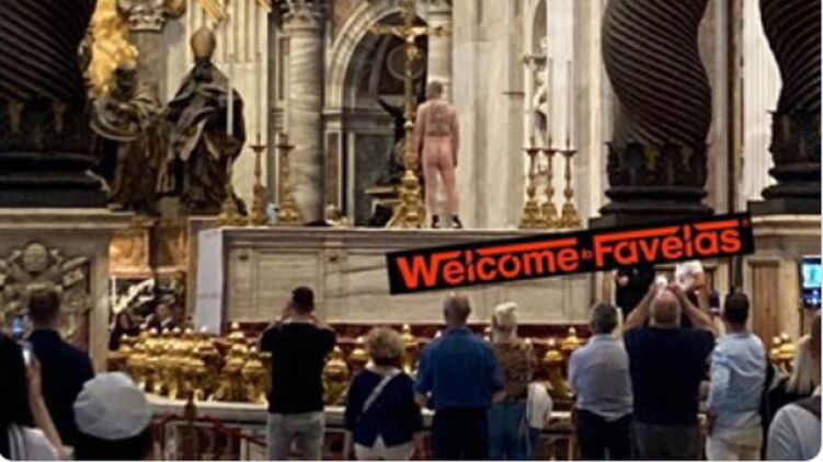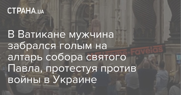 У соборі святого Петра у Ватикані чоловік висловив свій протест проти війни в Україні тим, що забрався на головний вівтар храму практично абсолютно оголеним. На ньому були лише шкарпетки та взуття.