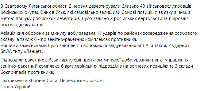 "У Сватовому Луганській області 2 червня дезертували близько 40 військовослужбовців російських окупаційних військ, які самовільно залишили бойові позиції", - йдеться у повідомленні.