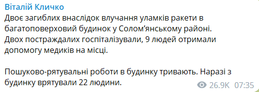 "Двоє загиблих внаслідок попадання уламків ракети в багатоповерхову будівлю в Солом'янському районі. Двох постраждалих госпіталізовано, 9 людей отримали допомогу медиків на місці", - повідомив мер Києва Віталій Кличко.