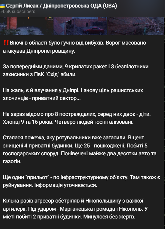 Сьогодні вночі Росія масово обстрілювала Дніпро та область. Пошкоджено приватні будинки, автомобілі та газопровід, є постраждалі.