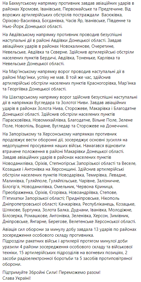 - Авіація та підрозділи ракетних військ та артилерії ЗСУ продовжують активні дії проти ворога. Минулої доби авіація сил оборони завдала 13 ударів по районах зосередження особового складу противника. Підрозділи ракетних військ та артилерії минулої доби вразили 4 райони зосередження особового складу та військової техніки, 15 артилерійських підрозділів на вогневих позиціях, 2 засоби радіоелектронної боротьби та 5 засобів ППО.