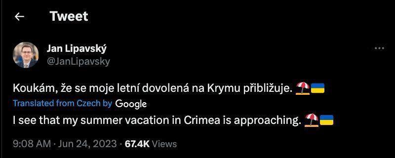 "Бачу, наближається мій літній відпочинок у Криму", - написав глава МЗС Чехії Ян Липавський.