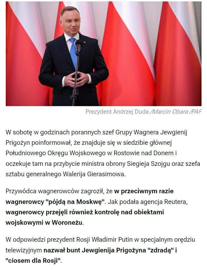 Президент Польщі Анджей Дуда наказав своїй армії бути в стані підвищеної бойової готовності у зв'язку з заколотом куратора ПВК "Вагнер" Євгена Пригожина в Росії.