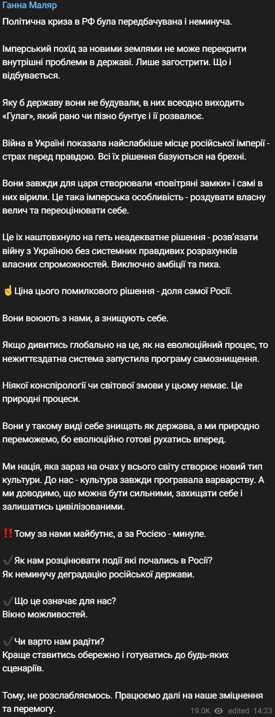 "Яку б державу вони не будували, у них все одно виходить "Гулаг", який рано чи пізно бунтує та розвалює. Війна в Україні показала найслабше місце російської імперії – страх перед правдою. Усі їхні рішення базуються на брехні. Вони завжди для царя створювали "повітряні замки" і самі в них вірили. Це така імперська особливість - роздмухувати власну велич і переоцінювати себе", - написала Маляр.