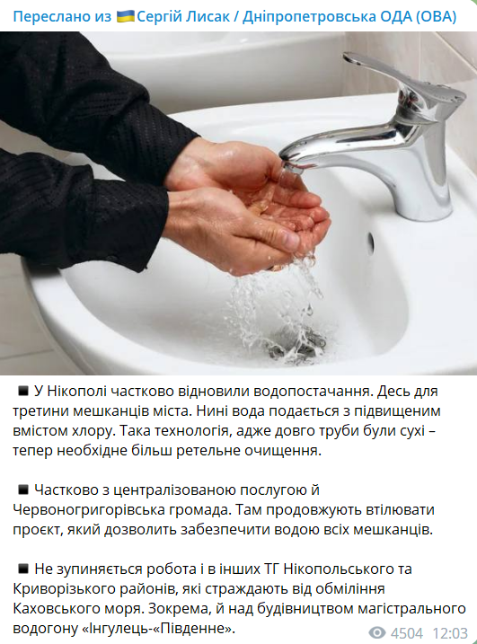 В Нікополі частково відновили водопостачання. Вода поки що подається з підвищеним вмістом хлору.