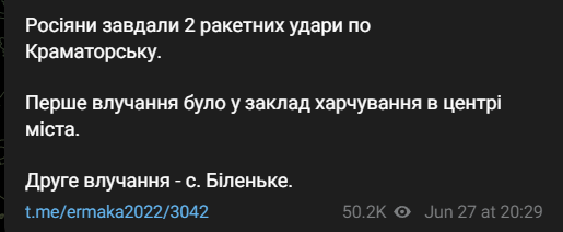 У своїх соцмережах він пише, що росіяни завдали 2 ракетних ударів по місту. Одне з влучень було закладом громадського харчування у центрі міста. Друге влучення – до села Біленьке.