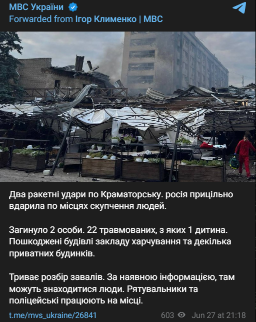 За його словами, удару по центру Краматорська було завдано о 19:32. Потрапили в район закладу громадського харчування, де було велике скупчення людей. 15 людей поранено внаслідок удару по Краматорську, заявив голова Донецької ОВ Павло Кириленко.