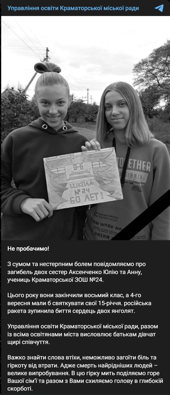 Стали відомі подробиці про загиблих під час ракетного удару по Краматорську. Серед них дві сестри, це 14-річні Юлія та Ганна Аксенченко, які навчалися у місцевій школі №24.