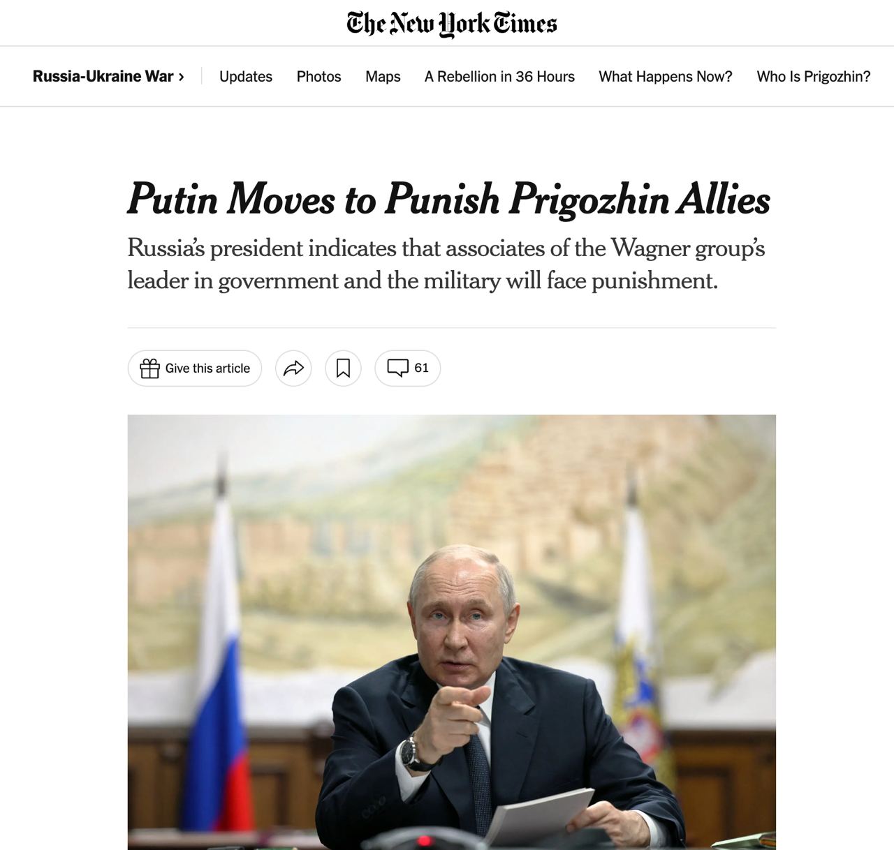 "Путін знав про плани заколоту Пригожина заздалегідь, як ми розуміємо, і тому міг підготуватися до певної міри, - сказав західний урядовець. - Він зміг побачити, хто що зробив того дня. І тепер він прибирає будинок".