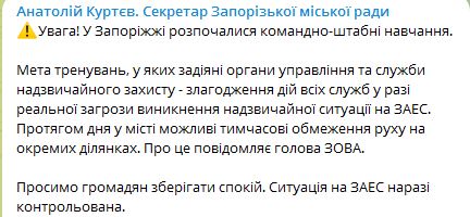 07.40 У Запоріжжі розпочалися командно-штабні навчання у разі загрози на ЗАЕС. На окремих ділянках у місті може перекриватися рух. Мешканців закликали не панікувати.