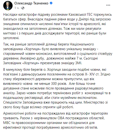 Після підриву росіянами Каховської ГЕС Мінкульт розпочав дослідження заповідної території. У ході цього і був виявлений унікальний човен-моноксил. Цей древній човен імовірно виготовлений з дуба, і має довжину близько 7 метрів.