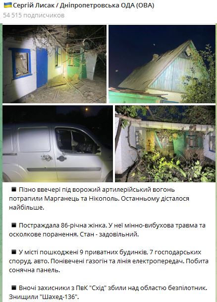 07.33 Пізнього вечора під ворожий артилерійський вогонь потрапили Марганець та Нікополь.