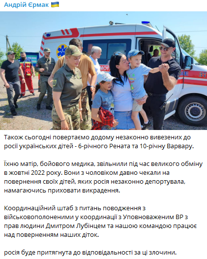 "Їх мати, бойового медика, звільнили під час великого обміну в жовтні 2022 року. Вони з чоловіком давно чекали на повернення своїх дітей, яких Росія незаконно депортувала, намагаючись приховати викрадення", - пише голова ВП.