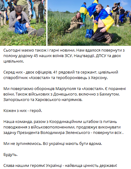Серед двох офіцерів, що повернулися додому, 41 рядовий і сержант, цивільний співробітник "Азовсталі" і тероборонець з Херсона. У деяких полонених є поранення. Вони воювали на донецькому, зокрема бахмутському, запорізькому та харківському напрямах.