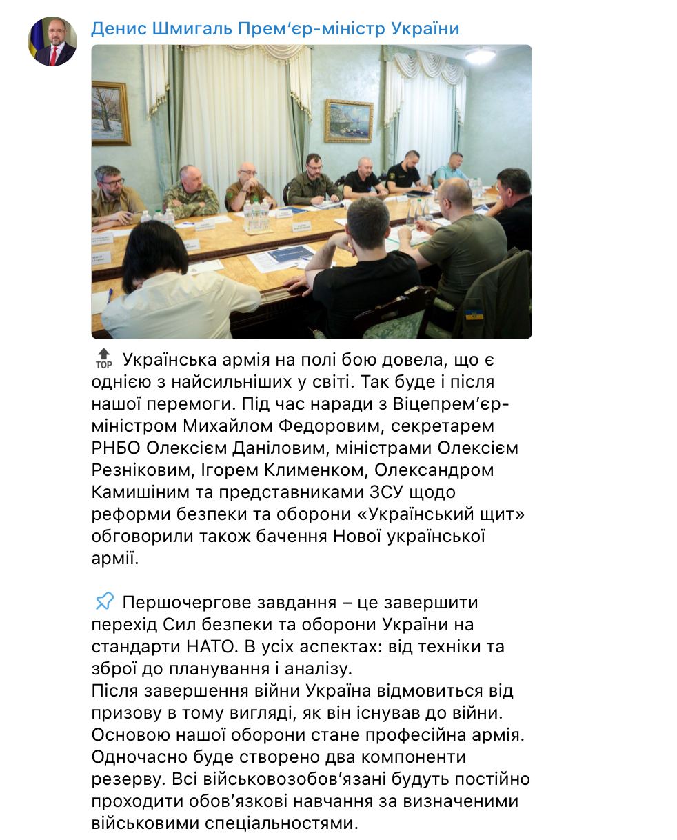 Після війни Україна відмовиться від призову та зробить ставку на професійну контрактну армію, заявив прем'єр Денис Шмигаль.
