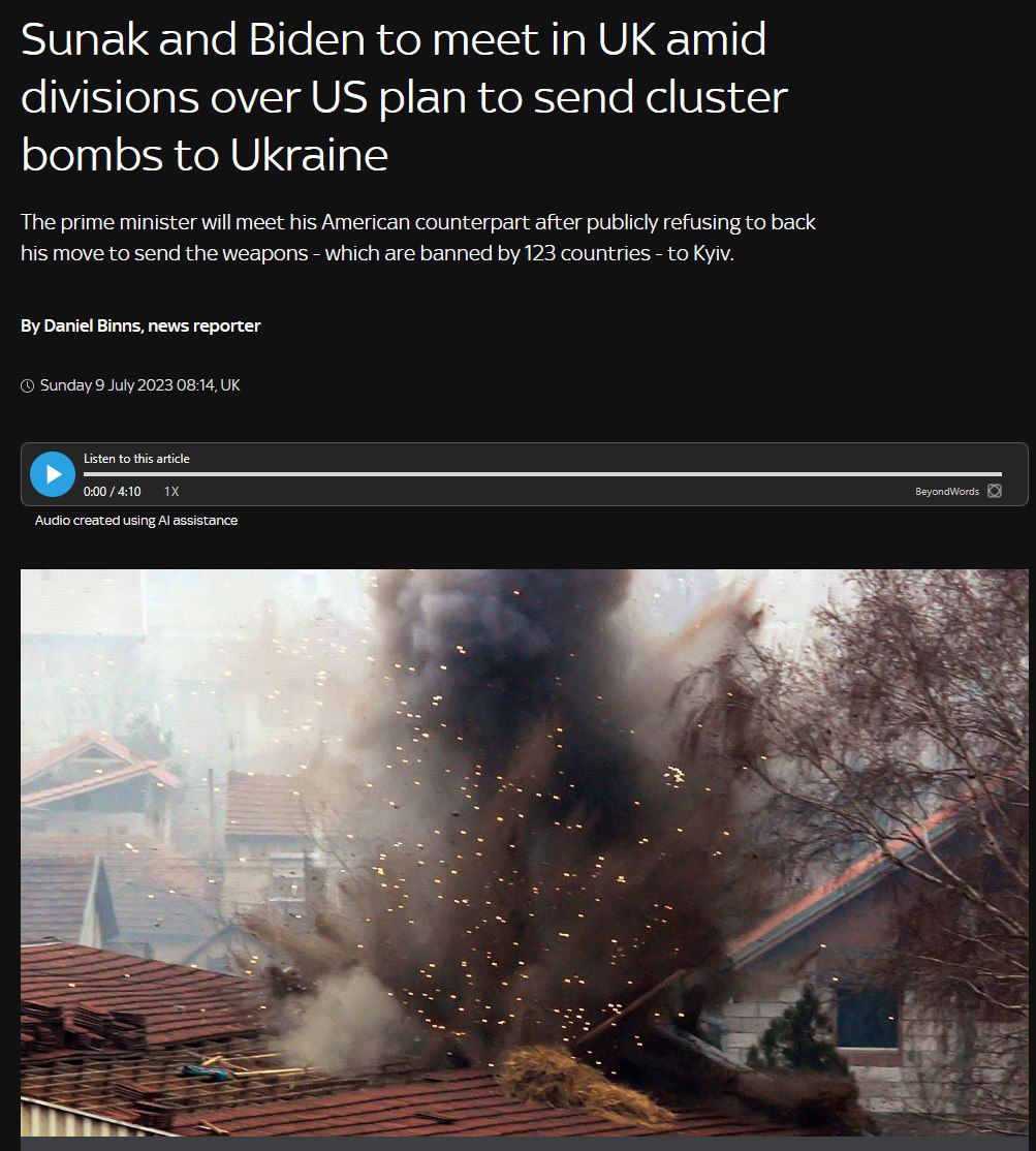 «Однією з тем порядку денного із Сунаком буде занепокоєння Лондона постачанням американських касетних боєприпасів Києву. Британія, Канада та ще низка країн висловилися проти постачання цього виду озброєнь Україні, оскільки вони становлять небезпеку для цивільного населення», – йдеться у публікації.
