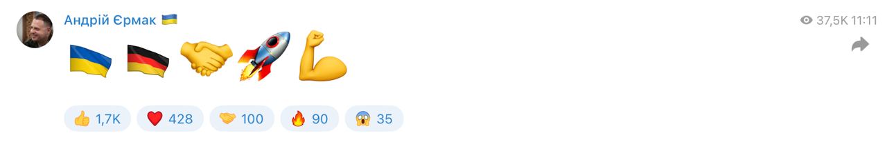 А голова ВП Єрмак тим часом смайликами дає зрозуміти, що Німеччина схвалила якесь постачання ракет Україні.