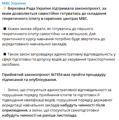 Відповідно до проекту, кожен зможе вибрати, як готуватися до першого теоретичного іспиту: самостійно чи в автошколі. Для практичного курсу навчання потрібно, як і раніше, звертатися до акредитованих навчальних закладів.