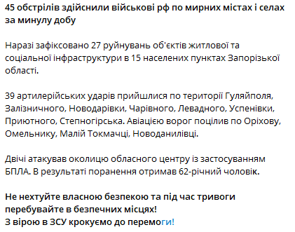 Голова Запорізької обласної військової адміністрації Юрій Малашко повідомив, що у Запоріжжі через ворожу атаку дронів поранення отримав 62-річний чоловік. Загалом РФ здійснила 45 обстрілів у мирних містах та селах за минулу добу. Зафіксовано 27 руйнувань об'єктів житлової та соціальної інфраструктури у 15 населених пунктах Запорізької області.