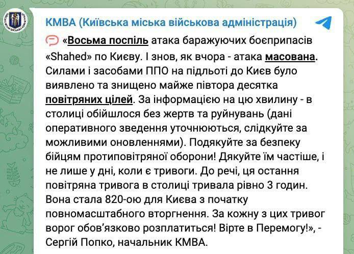 Остання повітряна тривога у столиці тривала три години. Вона стала 820-ю для Києва з початку повномасштабного вторгнення.