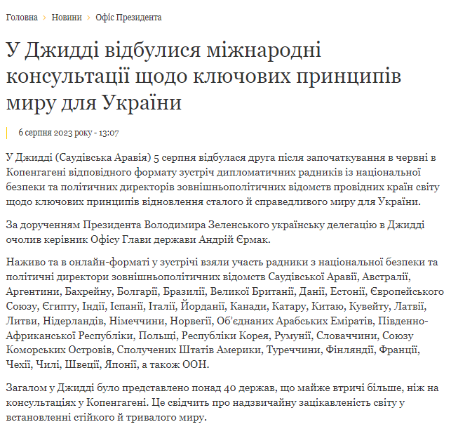 У Джідді Саудівській Аравії відбулися міжнародні консультації щодо ключових принципів відновлення сталого та справедливого світу для України. Загалом у Джідді було представлено понад 40 держав, що майже втричі більше, ніж на консультаціях у Копенгагені.