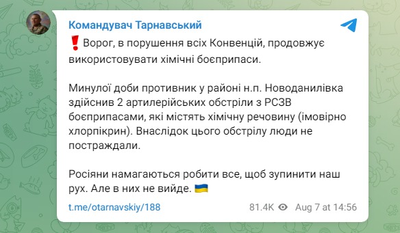 Як заявив Тарнавський, росіяни за добу двічі використовували боєприпаси до РСЗВ, які містять хімічні речовини. Імовірно йдеться про хлорпікрин. При цьому люди через застосування цієї речовини не постраждали.
