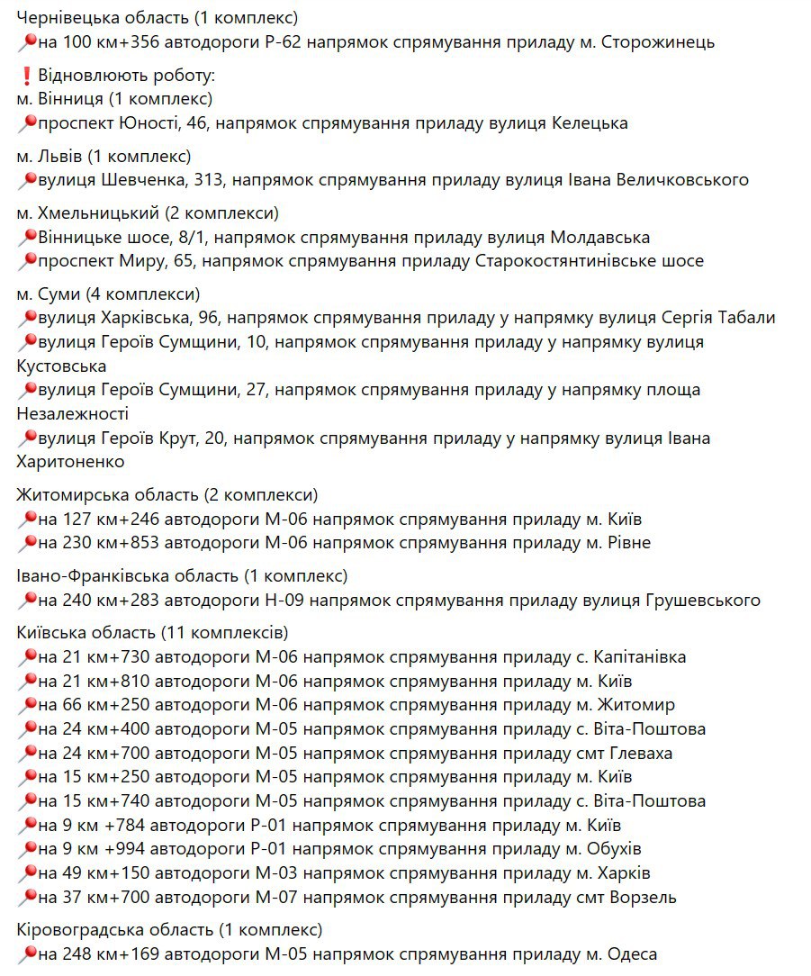 Повний список локацій, де з 11 серпня відновиться відеофіксація – на скріншоті.