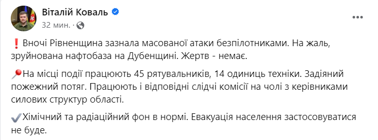 "Вночі Рівненщина зазнала масованої атаки безпілотниками. На жаль, зруйновано нафтобазу в Дубенщині. Жертв – ні", - написав Коваль.