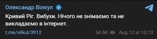 "Кривий Ріг. Вибухи. Нічого не знімаємо і не викладаємо в інтернет", - написав Вілкул у своєму телеграм-каналі.