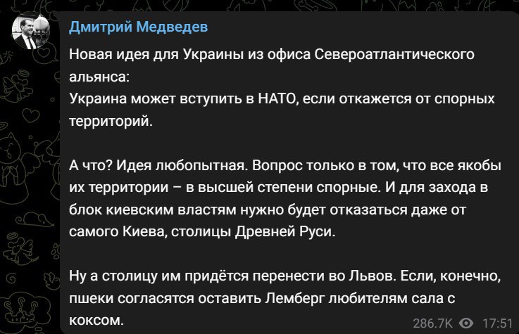 "Ідея цікава. Питання лише в тому, що всі їх (України - Ред. ) території – дуже спірні. І для заходу в блок київській владі потрібно буде відмовитися навіть від самого Києва, столиці Давньої Русі. Ну а столицю їм доведеться перенести у Львів", – написав Медведєв у Твіттері.