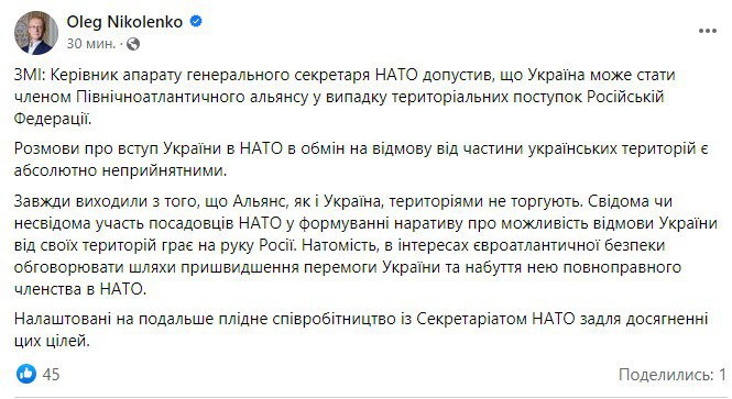 "Завжди виходили з того, що Альянс, як і Україна, територіями не торгують. Свідома чи несвідома участь посадових осіб НАТО у формуванні наративу про можливість відмови України від своїх територій грає на руку Росії", – написав Ніколенко у Фейсбуці.