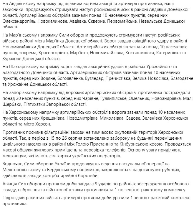 - Сталося 15 бойових зіткнень. Відбито російські атаки на напрямках: Куп'янському – у районі Сеньківки, Бахмутському – у районі Богданівки, Авдіївському – у районі Авдіївки, Мар'їнському – у районі Мар'їнки.