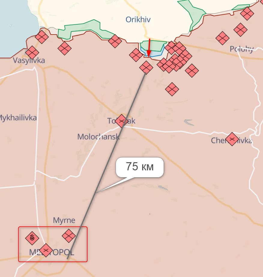 Зараз українська армія приблизно за 75 кілометрів від Мелітополя прямою. Але якщо говорити про наземний наступ, до найкоротшого шляху до рубежу стрілянини кримським коридором ЗСУ треба подолати ще 66 кілометрів.