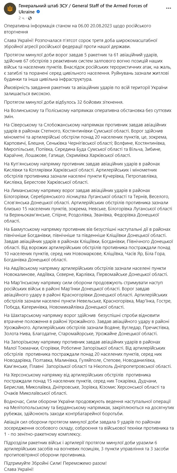 Минулої доби росіяни завдали 5 ракетних і 61 авіаційний удар, здійснили 67 обстрілів з реактивних систем залпового вогню по позиціям наших військ та населеним пунктам. Протягом минулої доби сталося 32 бойові зіткнення.