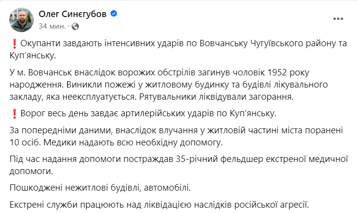 "У Вовчанську в результаті ворожих обстрілів загинув чоловік 1952 року народження. Виникли пожежі в житловому будинку і будівлі лікувальної установи, що не експлуатується", - написав Синегубов.