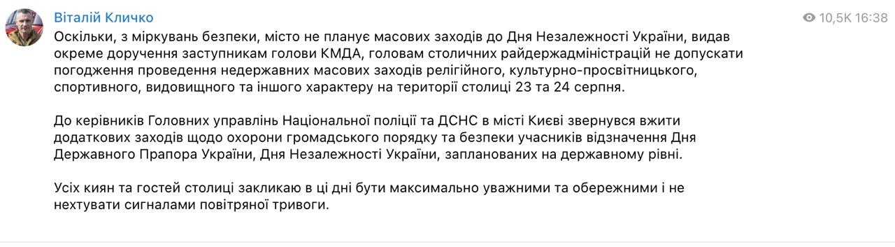 Він доручив чиновникам не погоджувати проведення будь-яких заходів релігійного, культурно-просвітницького, спортивного, видовищного та іншого характеру на території столиці 23 та 24 серпня.
