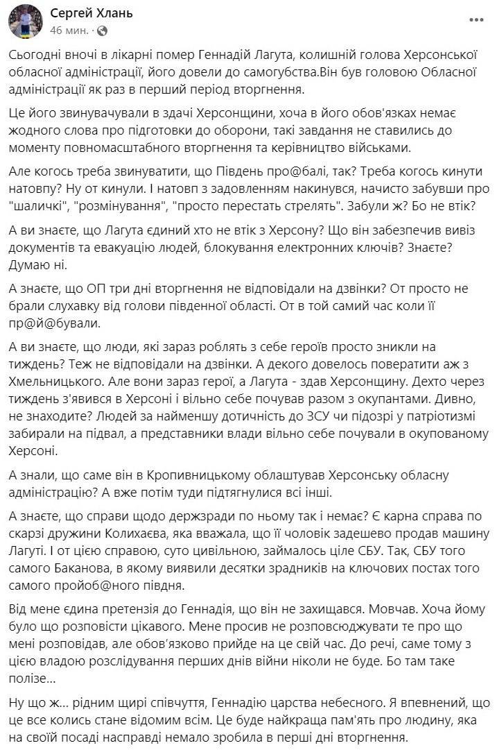 За словами Хланя, Лагуту довели до самогубства звинуваченнями у "здачі Херсона". Хоча, на думку депутата, ці звинувачення є безпідставними.